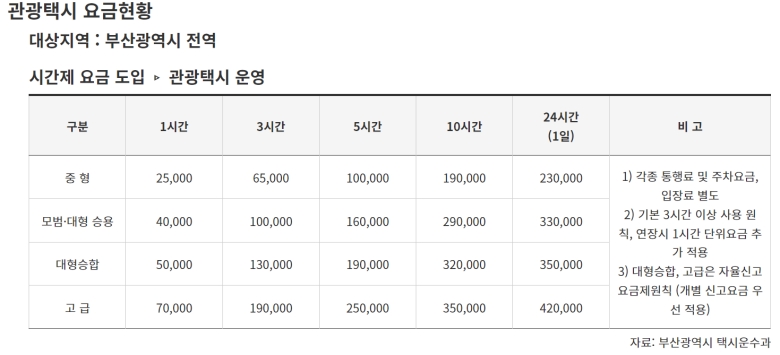 부산을 제대로 구경하고 싶은 분들을 위해 시간 단위로 빌려 타는 방식에 대한 안내표도 아주 꼼꼼하게 정리되어 있더라고요. 차종과 이용 시간에 따라 금액이 정해져 있어서 여행 계획을 세울 때 미리 이 표를 참고한다면 바가지 쓸 걱정 없이 즐겁게 부산 여행을 즐길 수 있는 최고의 꿀팁이 될 거예요.