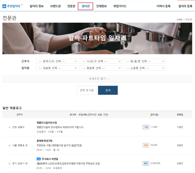 정규직보다는 조금 더 가벼운 마음으로 시작하고 싶을 때는 파트타임 위주로 찾아보는 것도 좋은 방법이에요. 상단 메뉴에서 알바를 선택하면 시간제로 근무할 수 있는 곳들만 따로 모아서 보여주니 효율적이었어요. 일급이나 시급으로 계산되는 곳들이 많아서 용돈 벌이 삼아 시작하려는 제 친구들에게도 적극 추천해주고 싶어요.
