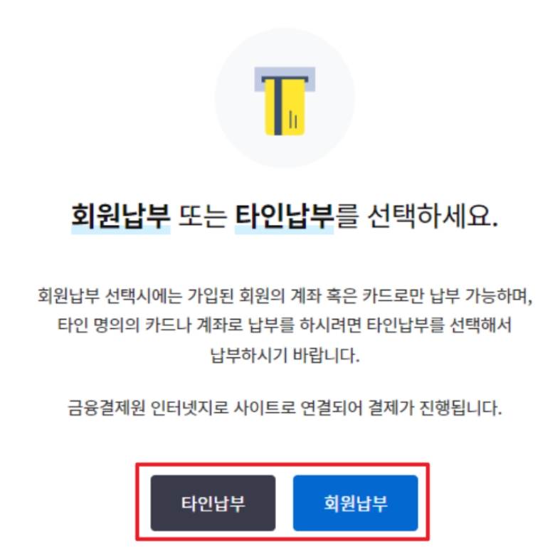 마지막 관문이에요. 본인 명의의 계좌나 카드로 결제할 거라면 '회원납부'를, 가족 카드처럼 다른 사람 명의로 대신 내주는 상황이라면 '타인납부'를 선택하면 돼요. 이 선택에 따라 다음 결제 화면이 조금 달라지니, 본인의 상황에 맞는 버튼을 눌러주시면 모든 과정이 마무리됩니다.