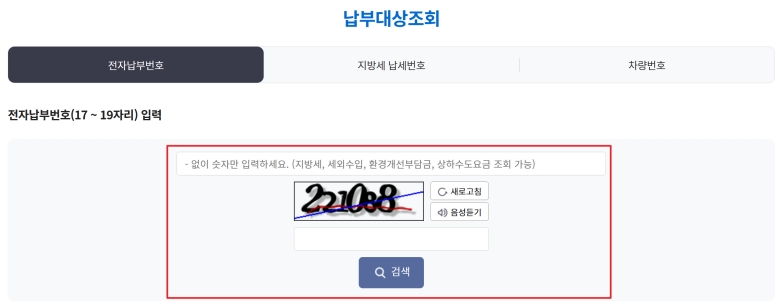 이제 번호를 입력할 차례예요. '전자납부번호' 탭이 선택된 것을 확인하고, 고지서에 적힌 17자리에서 19자리 숫자를 빈칸 없이 쭉 입력해 주세요. 바로 아래에는 이상한 그림 문자가 보일 텐데, 이건 자동 입력을 막기 위한 보안 절차예요. 보이는 숫자를 그대로 아래 칸에 옮겨 적고 '검색'을 누르면 됩니다.