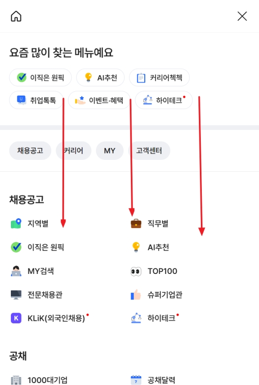 전체 메뉴를 열면 정말 다양한 항목들이 빼곡하게 있어서 처음엔 조금 복잡하게 느껴질 수 있어요. 하지만 당황하지 마시고, 여러 항목 중에서 우리는 '커리어'라는 부분을 찾으면 돼요. 보통 채용공고나 MY 메뉴를 주로 보게 되는데, 연봉계산기 같은 유용한 기능들은 바로 이 '커리어' 부분에 모여있답니다.