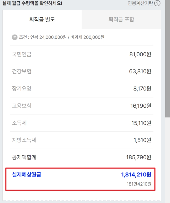 만약 연봉에 퇴직금이 포함된 계약을 하셨다면 상단의 '퇴직금 포함' 탭을 눌러서 따로 계산해 보셔야 해요. 이 경우 매달 월급의 일부가 적립되기 때문에 '퇴직금 별도'일 때보다 실수령액이 조금 줄어들게 돼요. 본인의 계약 조건에 맞는 금액을 확인하는 것이 정확합니다.