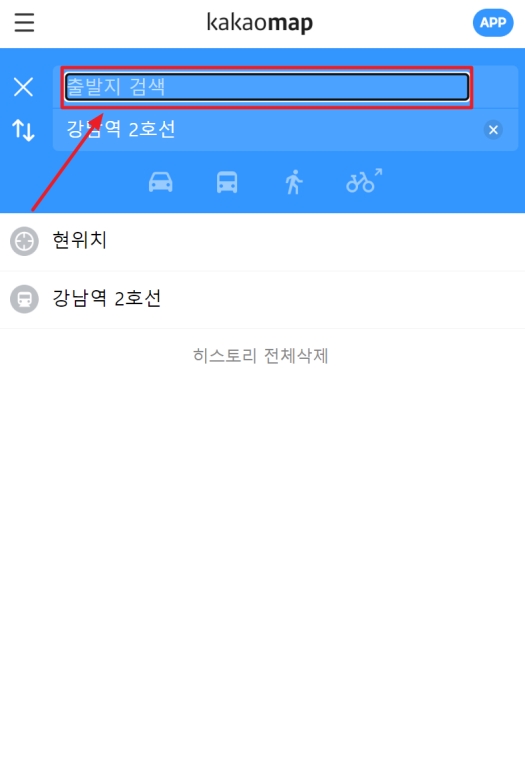 목적지를 정했다면 이제 내가 어디서 출발할지 알려줘야 하는데 화면 위쪽에 파란색 칸이 생길 거예요. 여기를 누르고 내 현재 위치를 선택하거나 다른 장소를 직접 입력해주면 준비가 모두 끝나요. 저도 처음엔 출발지를 안 적고 왜 길이 안 나오나 멍하니 있었던 우스운 기억이 나네요.