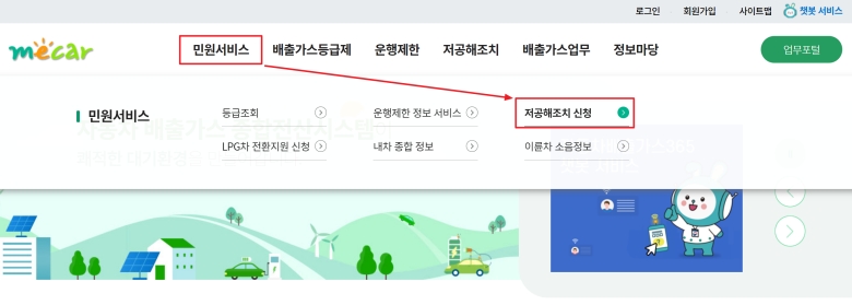 내 차가 대상이라는 걸 확인했다면 이제 본격적으로 보조금을 받기 위한 신청을 할 차례인데 아까 봤던 메뉴로 다시 가야 해요. 이번에는 오른쪽 끝에 있는 저공해조치 신청이라는 항목을 선택하면 되는데 여기가 바로 보물 창고로 가는 문이죠. 저도 이 과정을 거치면서 조금씩 마음의 짐을 덜어내는 기분이 들어서 아주 뿌듯했답니다.