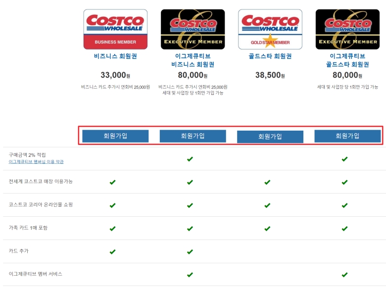 어떤 회원권을 고를지 마음속으로 정했다면, 이제 각 회원권의 상세한 혜택을 비교해볼 차례예요. 화면을 아래로 내려보면 각 회원권으로 어떤 혜택을 받을 수 있는지 표로 깔끔하게 정리되어 있어요. 전 세계 코스트코 매장 이용 가능 여부나 구매금액의 2% 적립 같은 혜택들을 꼼꼼히 비교해보고 최종적으로 나에게 가장 유리한 것을 선택하면 돼요. 결정했다면, 원하는 회원권 아래에 있는 '회원가입' 버튼을 눌러 다음 단계로 진행해주세요.