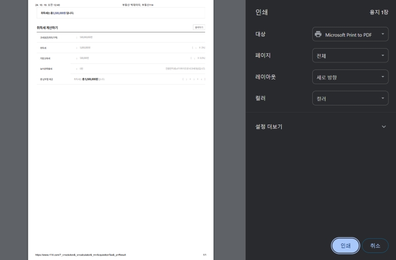 계산 버튼을 누르면 잠시 뒤에 결과가 화면에 나타납니다. 가장 먼저 눈에 들어오는 것은 바로 '총 취득세' 금액일 거예요. 이 금액이 바로 우리가 실제로 내야 할 세금의 총합이죠. 그 아래로는 취득세, 지방교육세, 농어촌특별세 등 각 항목별로 세금이 어떻게 구성되어 있는지도 자세히 보여줍니다. 모든 내용을 확인했다면, 나중에 증빙 자료로 활용하거나 기록을 남겨두기 위해 우측 상단의 '출력하기'를 눌러주는 것이 좋아요.