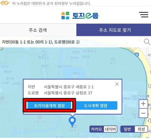 지도를 보다가 드디어 궁금했던 위치를 찾았다면, 해당 부분을 가볍게 한번 눌러보세요. 그러면 작은 창이 하나 뜨면서 그 위치의 지번 주소와 도로명 주소가 표시될 거예요. 이제 거의 다 왔어요. 주소가 맞는지 다시 한번 확인한 뒤에, 파란색 버튼 두 개 중에서 왼쪽에 있는 '토지이용계획 열람'을 눌러주면 됩니다. 이 버튼 하나로 해당 토지에 대한 모든 규제 사항이나 계획들을 상세하게 들여다볼 수 있는 페이지로 바로 이동하게 되니까, 정말 편리하게 정보를 얻을 수 있죠.