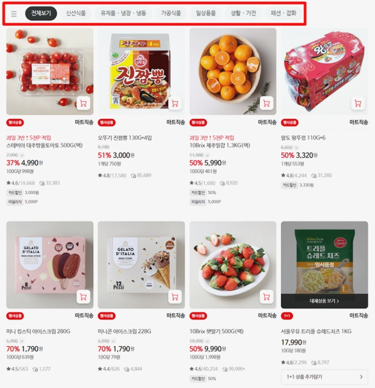 '전단행사'로 들어오면 가장 먼저 '전체보기' 화면이 우리를 반겨줘요. 말 그대로 지금 할인하고 있는 모든 상품을 한꺼번에 보여주는 곳이죠. 하지만 이렇게 보면 종류가 너무 많아서 오히려 고르기 힘들 수 있어요. 그럴 때는 화면 위쪽에 있는 '신선식품', '가공식품', '일상용품' 같은 카테고리들을 이용하면 좋아요. 내가 딱 원하는 종류의 상품들만 골라서 볼 수 있기 때문에, 시간을 훨씬 절약하면서 현명한 쇼핑을 할 수 있게 도와준답니다.