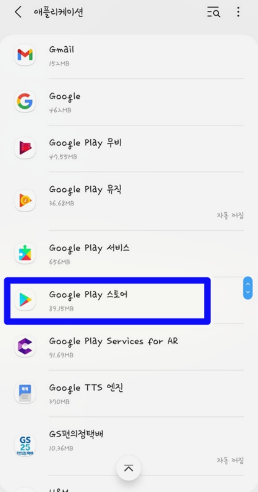 '애플리케이션' 메뉴로 들어오면 내 휴대폰에 설치된 모든 앱들의 목록이 가나다순으로 쭉 나열될 거예요. 여기서 우리가 찾아야 할 'Google Play 스토어'를 찾기 위해 화면을 아래로 계속 내려주세요. 앱이 워낙 많아서 찾기 번거로울 수 있지만, 'G' 부분까지 천천히 내리다 보면 금방 눈에 띌 겁니다. 찾으셨다면 해당 항목을 가볍게 눌러주세요.