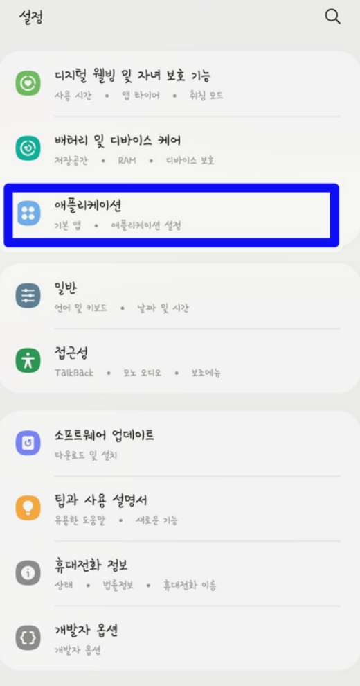 휴대폰 설정 메뉴를 열면 빼곡한 글씨 때문에 어디로 들어가야 할지 막막하게 느껴질 수 있어요. 그럴 땐 당황하지 마시고 화면을 천천히 아래로 내려보세요. 중간쯤에 톱니바퀴 아이콘과 함께 있는 '애플리케이션'이라는 항목을 쉽게 찾을 수 있을 거예요. 여기가 바로 내 휴대폰에 설치된 모든 앱들을 관리하는 곳이랍니다. 우선 이 메뉴를 눌러서 다음 화면으로 넘어가 주세요.