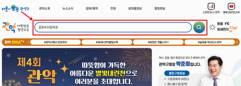 관악산 등산 지도를 찾으려고 하니 어디서부터 시작해야 할지 막막하시죠? 저도 처음엔 그랬어요. 가장 확실한 정보를 얻기 위해 관악구청 홈페이지에 들어가 보기로 했어요. 사이트에 접속하면 상단이나 중앙에 검색창이 보이실 거예요. 거기에 '공원녹지정책과'라고 입력하고 검색 버튼을 눌러주세요. 이 부서가 관악산 공원 관련 업무를 담당하고 있어서, 정확한 자료를 찾을 수 있는 가장 빠른 길이랍니다.