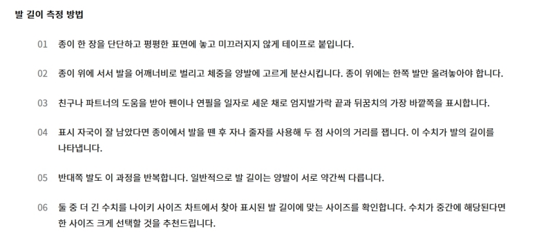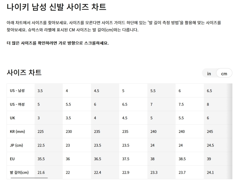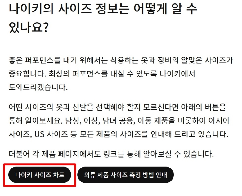 안내 페이지로 넘어가면 여러 가지 버튼이 보이는데 그중에서 나이키 사이즈 차트라고 적힌 검은색 버튼을 누르면 돼요. 옷이나 장비 측정법도 있지만 신발이 목적이라면 이 버튼을 눌러야 모델별 구체적인 수치를 확인할 수 있거든요. 저는 이 과정을 거치면서 단순히 숫자만 보는 게 아니라 내 발의 특성을 고려하게 되었어요.