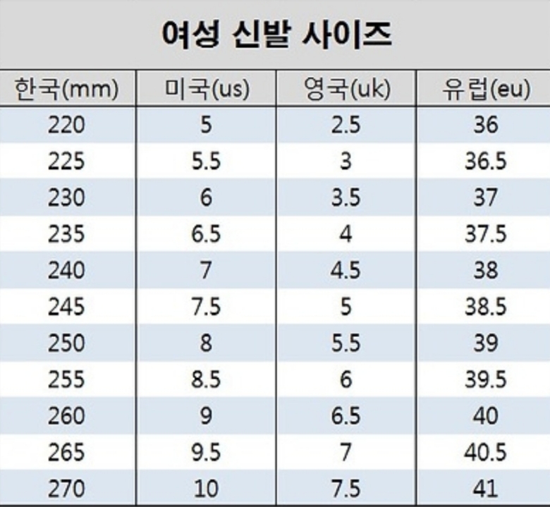 여성용은 남성용과 기준이 또 달라서 자칫하면 큰 실수를 할 수도 있겠더라고요. 제 친구도 남녀 공용인 줄 알고 샀다가 낭패를 본 적이 있는데 여성용 차트를 따로 보는 게 필수예요. 240미리를 기준으로 미국은 7이고 유럽은 38이라고 적혀 있으니 성별에 맞는 표를 꼭 구분해서 확인하는 습관을 들여야 해요.