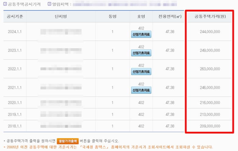 검색을 마치면 연도별로 정리된 상세한 표가 화면에 나타나는데 이게 정말 핵심이에요. 오른쪽 끝에 있는 공동주택가격 기둥을 보면 매년 가격이 어떻게 변해왔는지 한눈에 비교할 수 있거든요. 세금 기준이 되는 금액이라 숫자를 아주 자세히 들여다보게 되더라고요. 전용 면적 대비 가격이 적당한지 살펴보는 과정에서 내 자산의 흐름을 파악할 수 있어 뿌듯했어요.