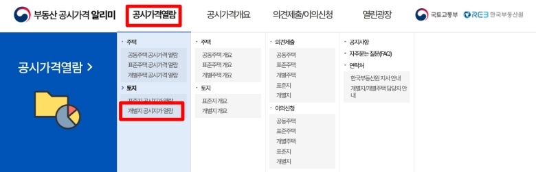 이제 주택 말고 땅의 가치를 알고 싶을 때 메뉴를 어떻게 옮겨야 하는지 알려드릴게요. 상단 메뉴 중에서 공시가격 열람에 마우스를 올리면 아래로 메뉴가 쭉 내려오는 데 여기서 개별공시지가 열람을 선택하면 돼요. 토지만 따로 떼어서 정확한 값을 매기는 과정이라 주택이랑은 또 다른 정보가 가득하더라고요. 저도 토지 메뉴를 따로 찾아야 한다는 걸 나중에야 깨달았답니다.
