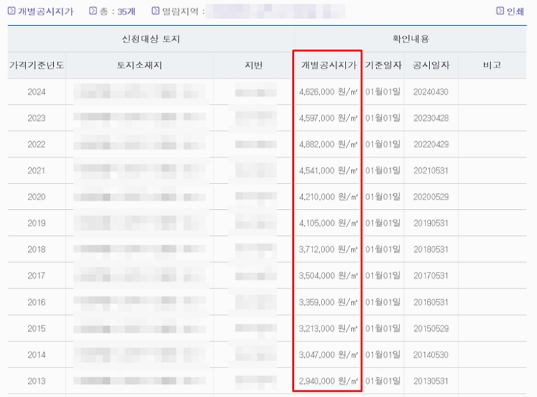 마지막으로 확인 단추를 누르면 해당 토지의 연도별 제곱미터당 가격이 표로 깔끔하게 정리되어 나와요. 1월 1일 기준일자와 함께 공시일자까지 적혀 있어서 공신력 있는 데이터라는 확신이 들더라고요. 예전 가격부터 최근까지 상승 폭을 보니 땅의 가치 변화가 실감 나서 신기했어요. 이렇게 직접 수치를 눈으로 확인하고 나면 앞으로 어떤 결정을 내릴 때 훨씬 든든한 밑거름이 된답니다.